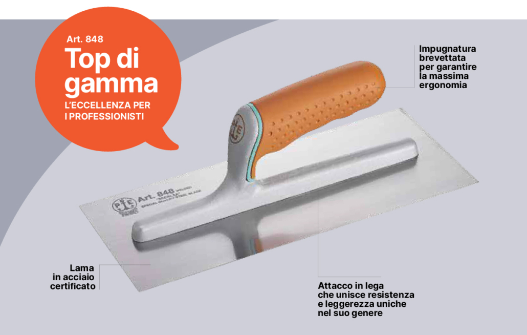 La lama in acciaio saldato garantisce stabilità e flessibilità: fondamentale quando si lavora con materiali a base di calce che vanno distesi e compattati senza graffiare la superficie. Lo spessore da 0,5 mm permette una maggiore sensibilità al tatto durante la fase di lucidatura. Il manico Eccelsa, ergonomico e ben bilanciato, assicura una presa stabile anche quando la sessione di lavoro è lunga. Lo strumento è prodotto in Italia da Pavan, azienda storica specializzata nella produzione di attrezzi per edilizia e finiture murarie, sinonimo di qualità e durata nel tempo.