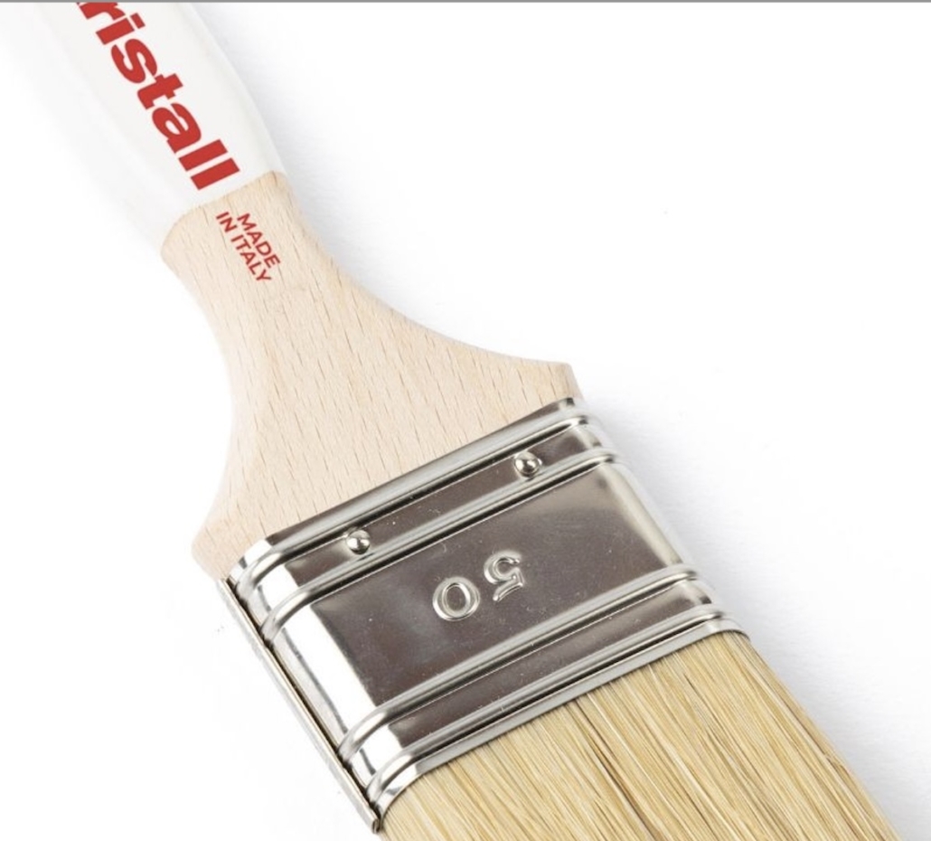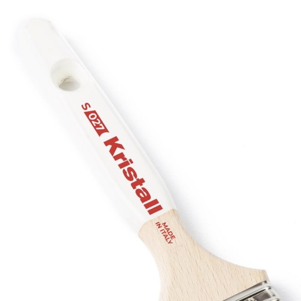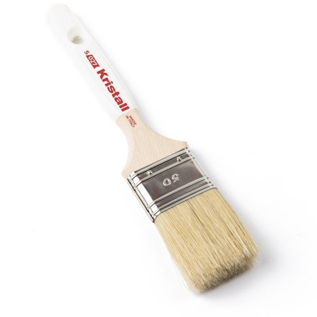 La pennellessa Kristall è realizzata con pura setola bionda cotta, una fibra naturale particolarmente elastica e resistente, capace di assorbire bene la pittura e rilasciarla in modo uniforme senza lasciare striature. Le setole sono fissate in resina epossidica, così da non perdere peli durante il lavoro e mantenere compattezza anche dopo lavaggi ripetuti. La ghiera in acciaio inox evita corrosione e dilatazioni, garantendo una lunga durata nel tempo. Il manico in legno verniciato è leggero, comodo da impugnare e consente un buon controllo nei dettagli e nei bordi. È disponibile in più larghezze (da 30 mm a 60 mm) per adattarsi sia alle piccole superfici sia alle zone dove serve precisione, come angoli, nicchie, telai e punti vicini a elementi che non devono essere sporcati.