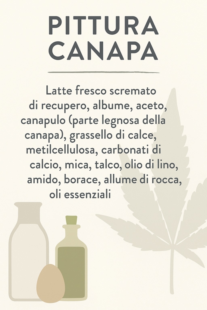 COMPONENTI: Latte fresco scremato di recupero, albume, aceto, canapulo (parte legnosa della canapa), grassello di calce, metilcellulosa, carbonati di calcio, mica, talco, olio di lino, amido, borace, allume di rocca, oli essenziali.