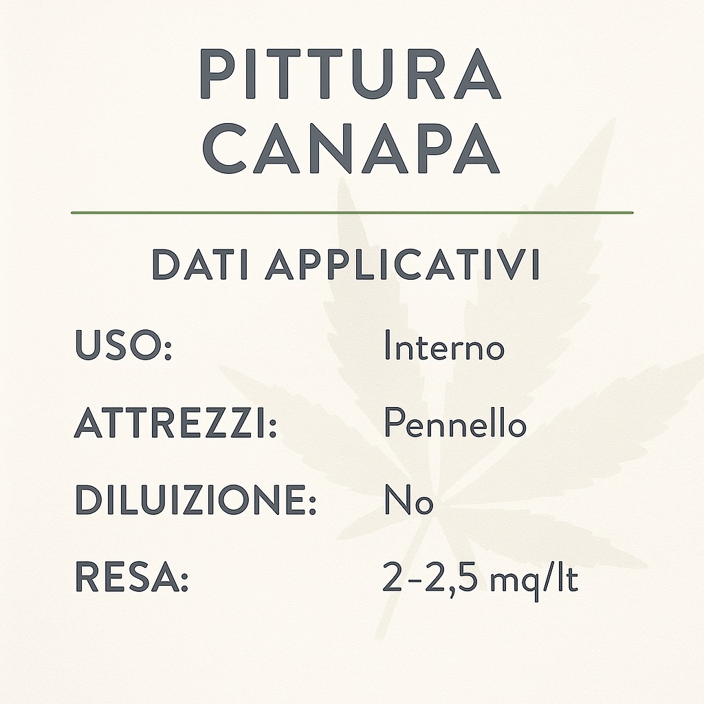 CARATTERISTICHE TECNICHE: Pittura Canapa si applica esclusivamente a pennello, senza diluizione, con una resa media di 2–2,5 m² per litro per mano, a seconda dell’assorbimento del supporto. È adatta a intonaci a base di calce o cemento, cartongesso e superfici minerali preparate con i fondi e i fissativi naturali Spring Color. La temperatura di applicazione deve essere compresa tra 7°C e 30°C, con umidità non superiore all’80%.