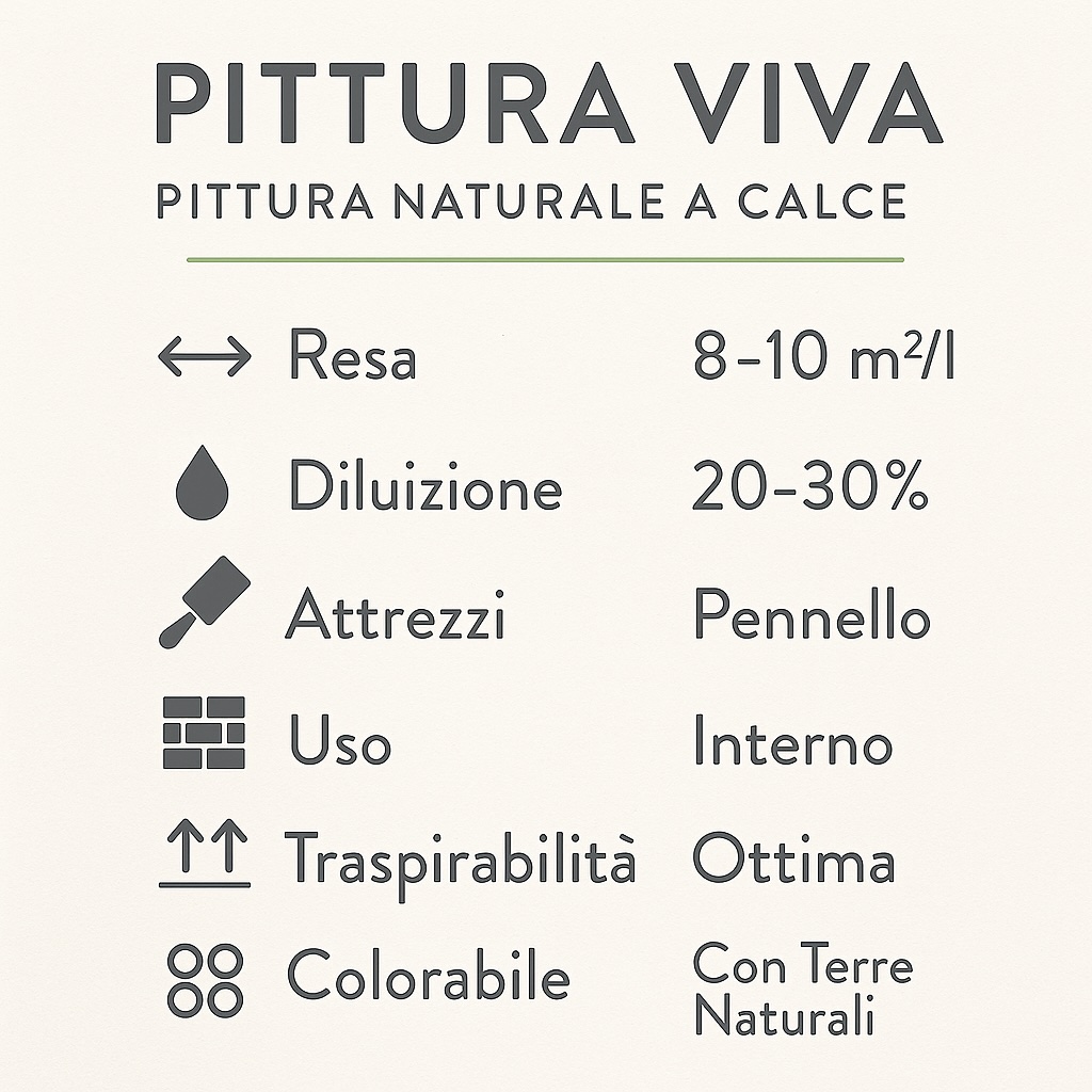 Pittura Viva è una pittura completamente naturale, formulata con grassello di calce stagionato a lunga maturazione e resine vegetali pure, senza l’aggiunta di sostanze di sintesi, derivati animali o solventi. È un prodotto che respira con la parete, lasciando passare il vapore acqueo e contribuendo a mantenere un microclima sano negli ambienti interni.