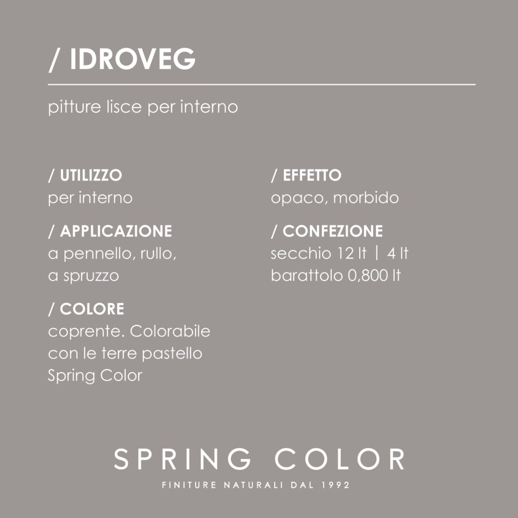 CARATTERISTICHE TECNICHE: IdroVeg è una pittura naturale a base di componenti vegetali e minerali, priva di derivati animali. Si stende facilmente a pennello, rullo o spruzzo, creando una superficie uniforme, morbida e opaca che lascia traspirare la parete senza alterarne la naturale permeabilità al vapore.