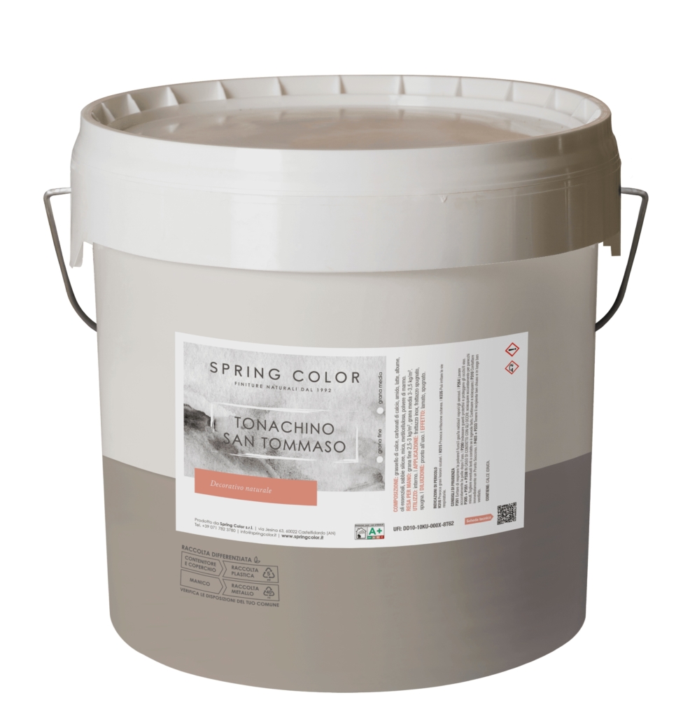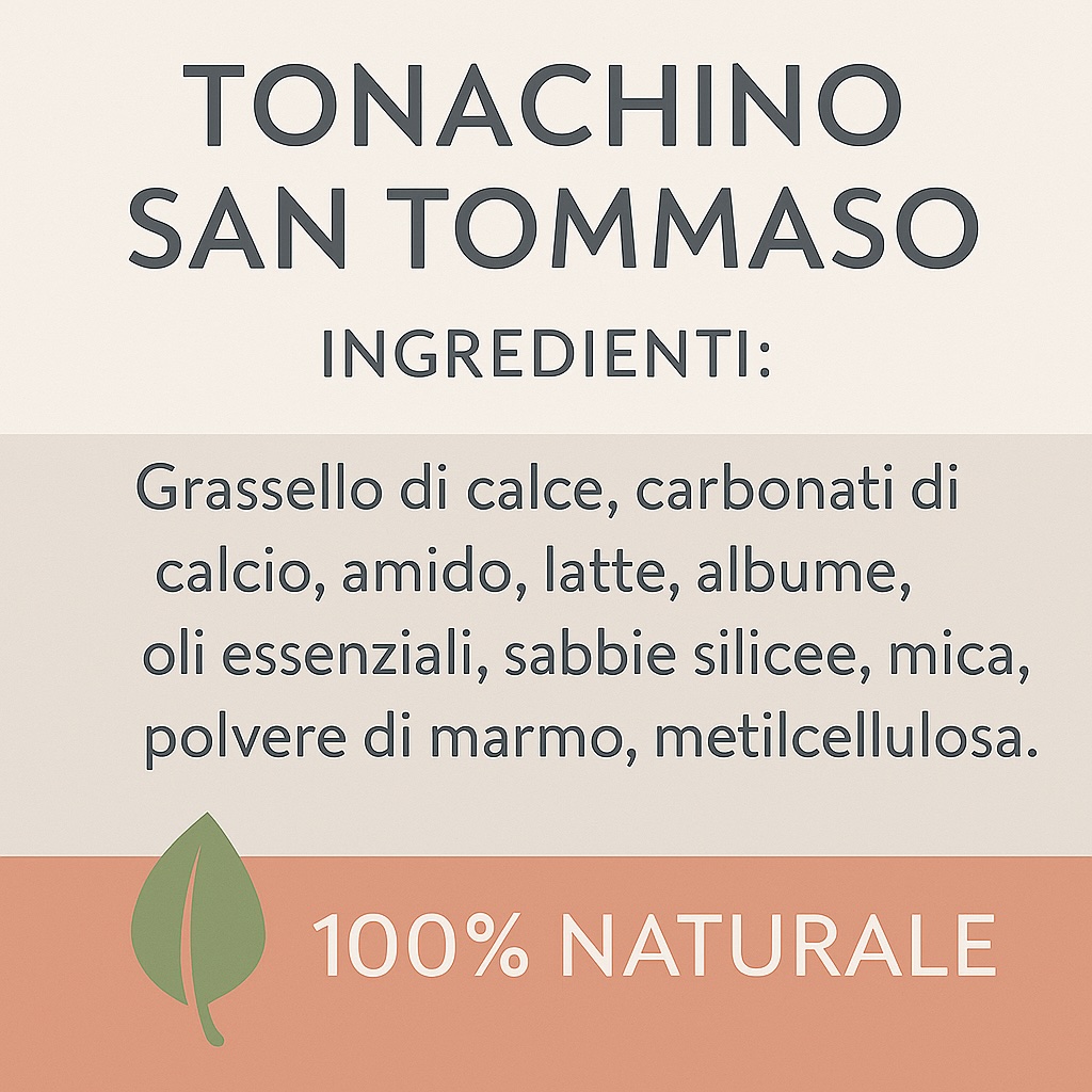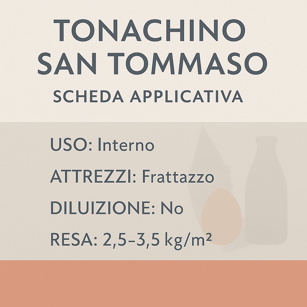 CARATTERISTICHE TECNICHE: Il Tonachino San Tommaso si presenta come una pasta color bianco caldo, pronta all’uso dopo un’accurata miscelazione. La finitura, di aspetto opaco e vellutato, è altamente traspirante e non forma pellicola, permettendo al muro di respirare naturalmente. È adatto per uso interno e può essere pigmentato con terre naturali, mantenendo inalterata la traspirabilità della calce. Si applica generalmente in due mani, a spatola o frattone, lasciando un intervallo di 6–8 ore tra una mano e l’altra.